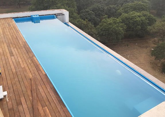 • Scope: Rooftop infinity pool (~9 m × 3.5 m) on penthouse roof slab, structural reinforcement, glass perimeter safety barrier, deck with composite wood finish, chilled water circulation for summer.
